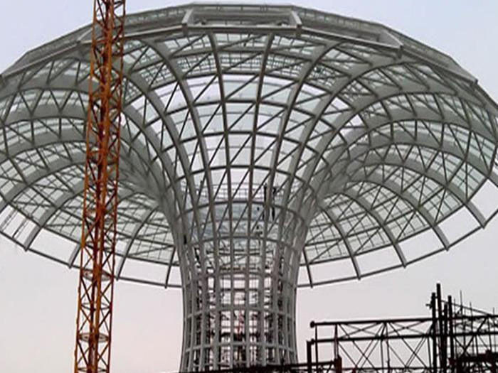 二、球形网架结构因其结构新颖,受力合理,自重轻、用钢量低等优点。如大型体育场馆球形奎屯螺栓球网架、公共场馆球形网架、电厂奎屯螺栓球网架、水泥工业球形网架、仓储物流球形网架、奎屯干煤棚工业球形网架、奎屯收费站奎屯加油站球形网架、展览中心、影剧院、商场、航站楼、候车厅、工厂奎屯车间、仓库、电视塔等球形螺栓球节点网架。国内球形网架结构主要分为:奎屯焊接球节点网架及螺栓球节点网架两种。螺栓球节点网架其构件工厂内加工量较大,现场安装便捷,适用于现场工期紧,奎屯施工条件、用电量受制约,网架形状复杂、奎屯杆件定位困难的异形结构。螺栓球节点球形网架系统基本由奎屯杆件、螺栓球、支撑支座等组成。按照节点形式可分为交叉奎屯桁架体系、四角锥体系、三角锥体系等。支撑方式多为固定支座支撑。对于大面积、大跨度及有特殊受力或伸缩要求的网架结构可采用橡胶支座、滑移支座、球铰支座等支撑形式,以满足结构自身的受力稳定、均衡,便于内力释放等设计要求。